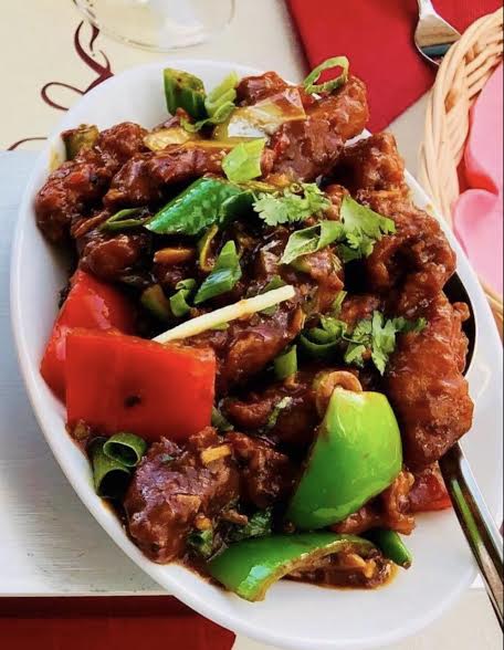 Pieces of chicken breast cooked with green-chili, onions, tomatoes, capsicum and ginger.