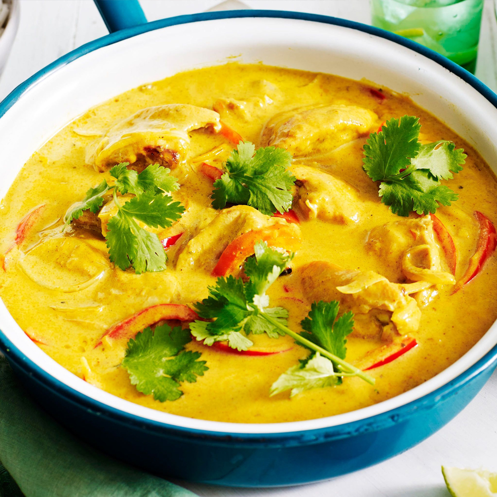 Morceaux de blancs de poulet cuits dans du chutney de mangue, du gingembre, de l’ail et diverses épices indiennes.