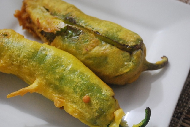 Green chili peppers stuffed with spiced mashed potatoes and deep fried.